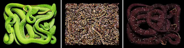 Guido Mocafico, Suiza, 1962, es un fotógrafo de la vida muerta, a pesar de que podría usar sujetos que están vivos. Es conocido por su serie colorida y impresionante llamada serpientes. Debido al confinamiento de las serpientes, se acurrucan y crean formas retorcidas. Esta serie, como muchos otros, también se lanzó como un libro. En la serie Movimiento, fotografió la maquinaria detrás de Clocktrabajo. Nuevamente, el fondo se mantiene negro, haciendo que los relojes salgan como grandes maravillas de tecnología. Las siguientes imágenes provienen de la serie serpientes, movimiento y Nature Morte.