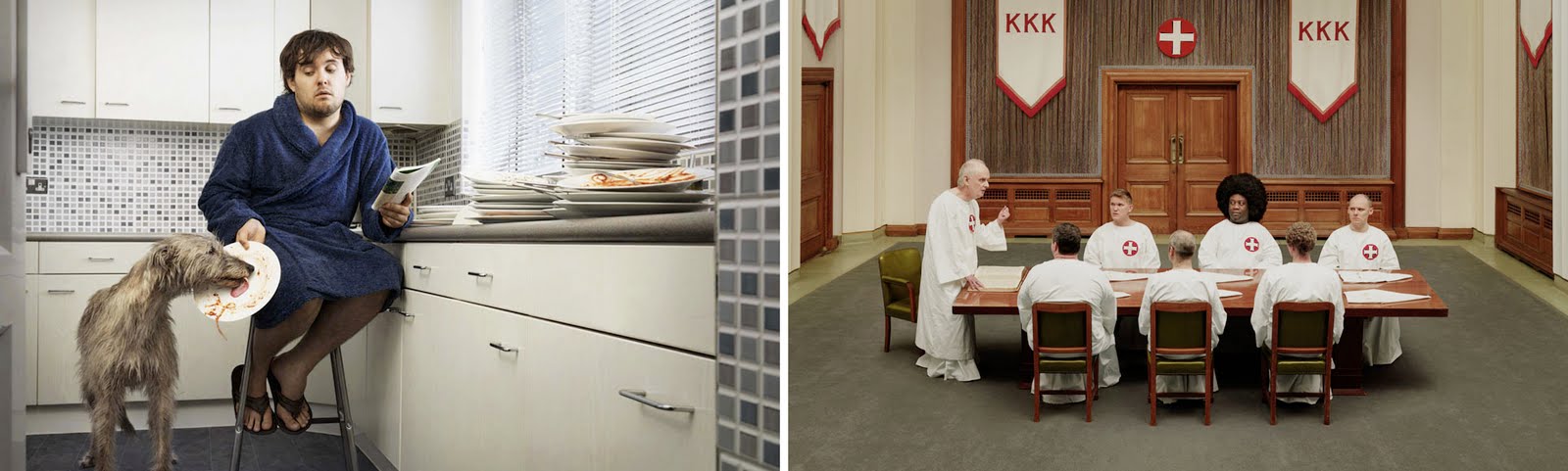 David Stewart, Great-Britain, 1958, es un fotógrafo que utiliza mucho humor en sus fotografías, esto también es visible en el diseño juguetón de su sitio web. En 2009 se publicó su último libro tres veces. Es una colección de imágenes que funcionan como una observación sobre las relaciones y la vida en general. En su sitio web se puede encontrar la categoría cosas. Varias imágenes humorísticas que se ocupan del lado más oscuro de la vida como el suicidio. Las siguientes fotografías provienen de tres veces eliminadas, cosas y decisiones.