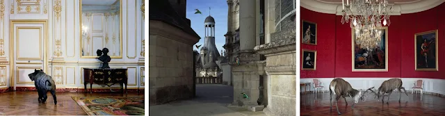 Karen Knorr, 1954, Alemania, fue criada en Puerto Rico. Su serie India Song consta de dos elementos. Las ubicaciones se han filmado con una cámara analógica de gran formato, los animales vivos con una cámara digital. Las dos imágenes se combinan para crear una imagen que desdibuja nuestra percepción de la realidad y la ficción. En su serie fábulas ella llama nuestra atención sobre el comportamiento animal y su relación con el comportamiento humano y las deficiencias. En la mayoría de las series recientes de Karen, usa museos, palacios u otros lugares culturales como entornos para su fotografía. Las siguientes imágenes provienen de India Song, Muses y Majas y fables (Château Chambord).