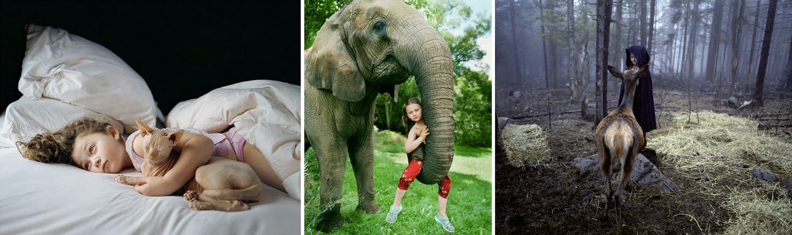 Robin Schwartz, EE. UU., 1957, tiene dos temas que ha fotografiado ampliamente. Una es su hija Amelia y la otra son animales. En los últimos años ha combinado tanto en su serie Amelia's World; Afinidad animal. Los retratos de su hija y las relaciones entre las especies es lo que intenta capturar para descubrir lo extraordinario. En su serie Amelia's World: Imaginary Tales explora a sus hijas que maduran la personalidad y la aptitud. Las siguientes imágenes provienen del mundo de Amelia: Animal Affinity y Tales imaginarios y de retratos de primates.