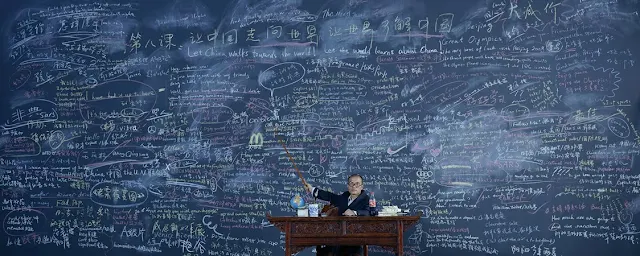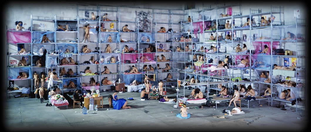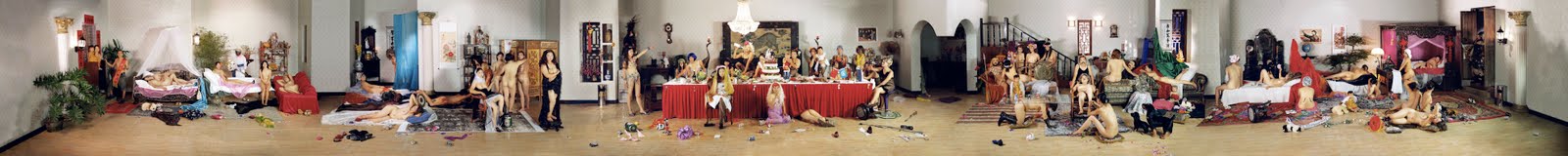 Wang Qingsong, China, 1966, fabrica imágenes grandes y escenificadas que se imprimen en enormes tamaños. Su fotografía Mansión China se extiende hasta la longitud de 12 metros. Qingsong a veces se describe como el "terrible terrible de la fotografía de arte chino". A menudo usa temas como la cultura y el materialismo del consumidor de China. Él ha descrito su proyecto como "kitsch, pero poderoso ... contradictorio, pero crítico". Además de la fotografía, también trabaja con video. Las siguientes imágenes son leche segura, Dormitorio, Mansión China y sígueme.