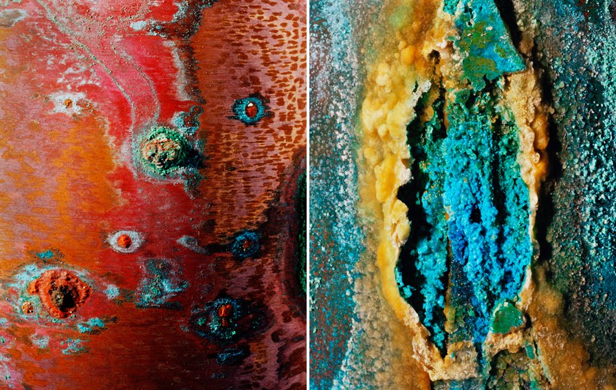 David Maisel, 1961, de los EE. UU., Más conocido por su fotografía desde el aire. Toma fotografías de paisajes con fascinación por el deterioro de la tierra. Durante décadas ha estado fotografiando minas de cobre. Sin embargo, desde el aire se vuelven más como pinturas abstractas.