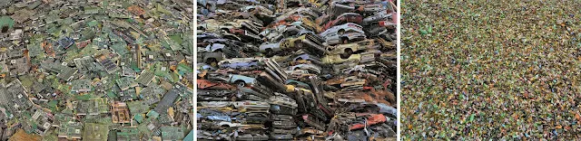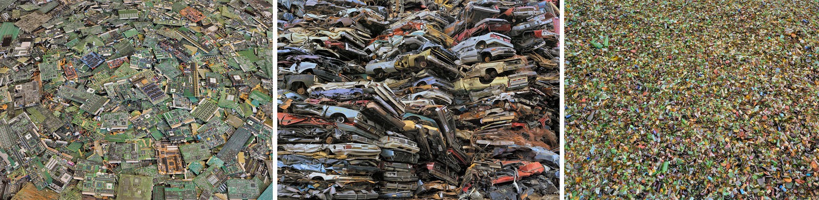 Chris Jordan, 1963, EE. UU., Se centra en el consumo masivo en su proyecto. Ha hecho una serie de imágenes llamadas ejecutando los números. Las imágenes se ven normales al principio, pero uno puede acercarse y ver que las imágenes están formadas por miles de barbies o paquetes de cigarrillos. ( ver sitio web ) Chris espera visualizar la cantidad de bienes que consumimos. En su serie Midway: Mensaje del Gyre ha fotografiado a los polluelos Albatross que han muerto porque los humanos los alimentaban causados por los humanos. Chris no ha movido ni agregado nada a los cadáveres. Las siguientes imágenes provienen de Midway, belleza intolerable y en Katrina's Wake.